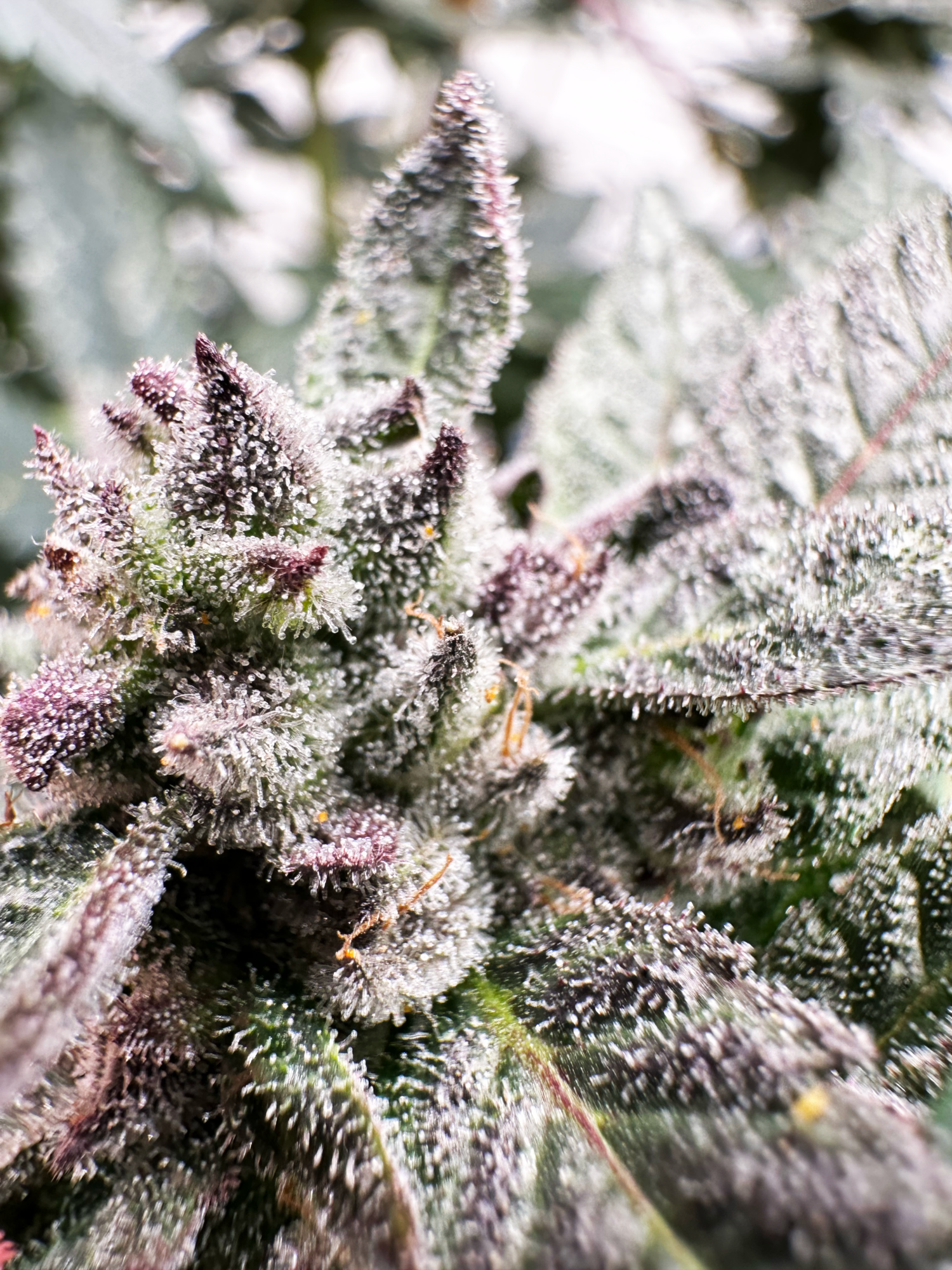 Appearance: Dark purple solid nugs with lots of white resin capped trichomes